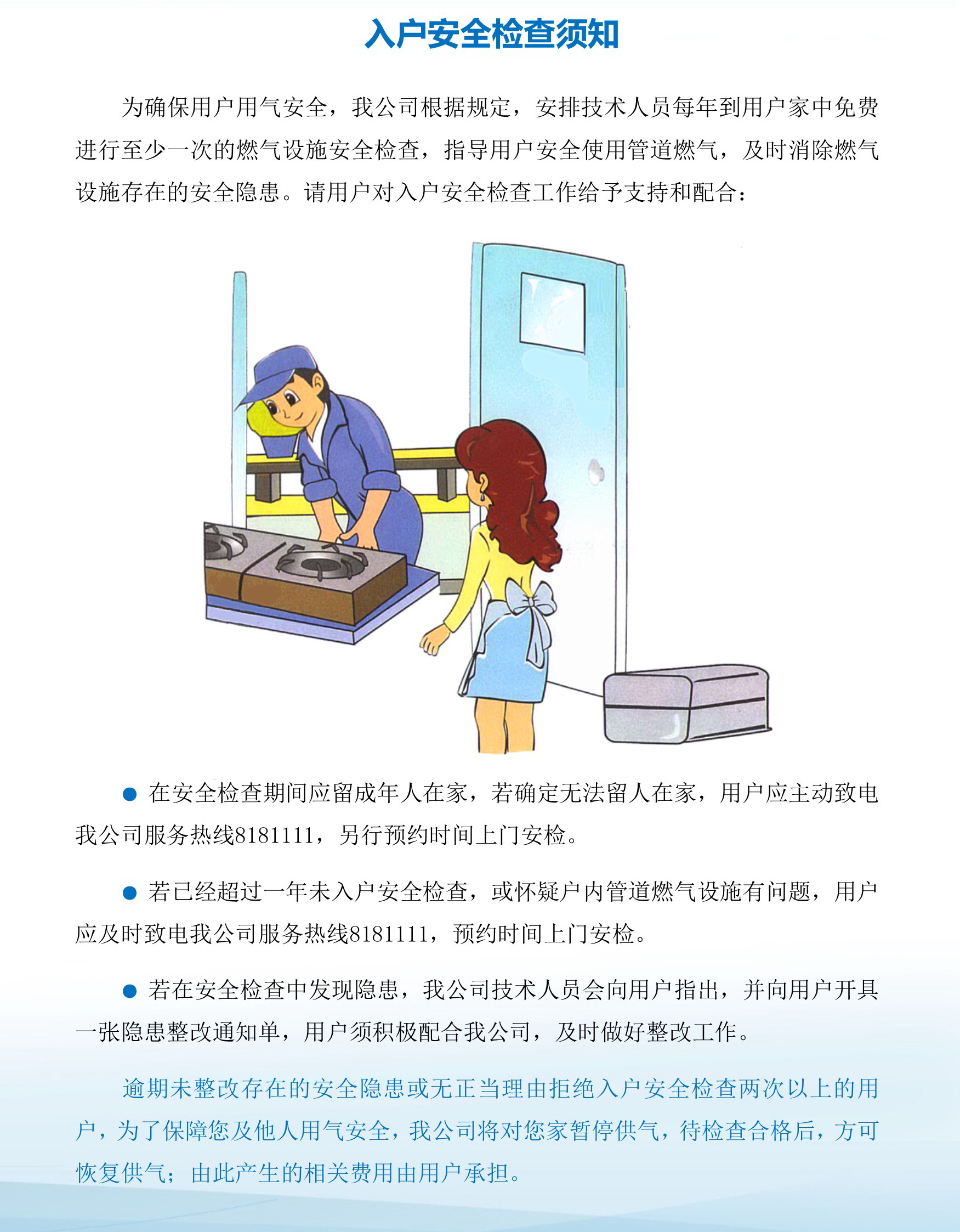 根據(jù)居民用戶年度安檢計劃,我公司定于7月下旬在恒翠山莊、吉寧山莊、卓夫山莊、御龍山莊、錦繡檸溪小區(qū)開展管道燃氣集中入戶安檢工作。具體信息可關注小區(qū)內張貼的安檢通告。