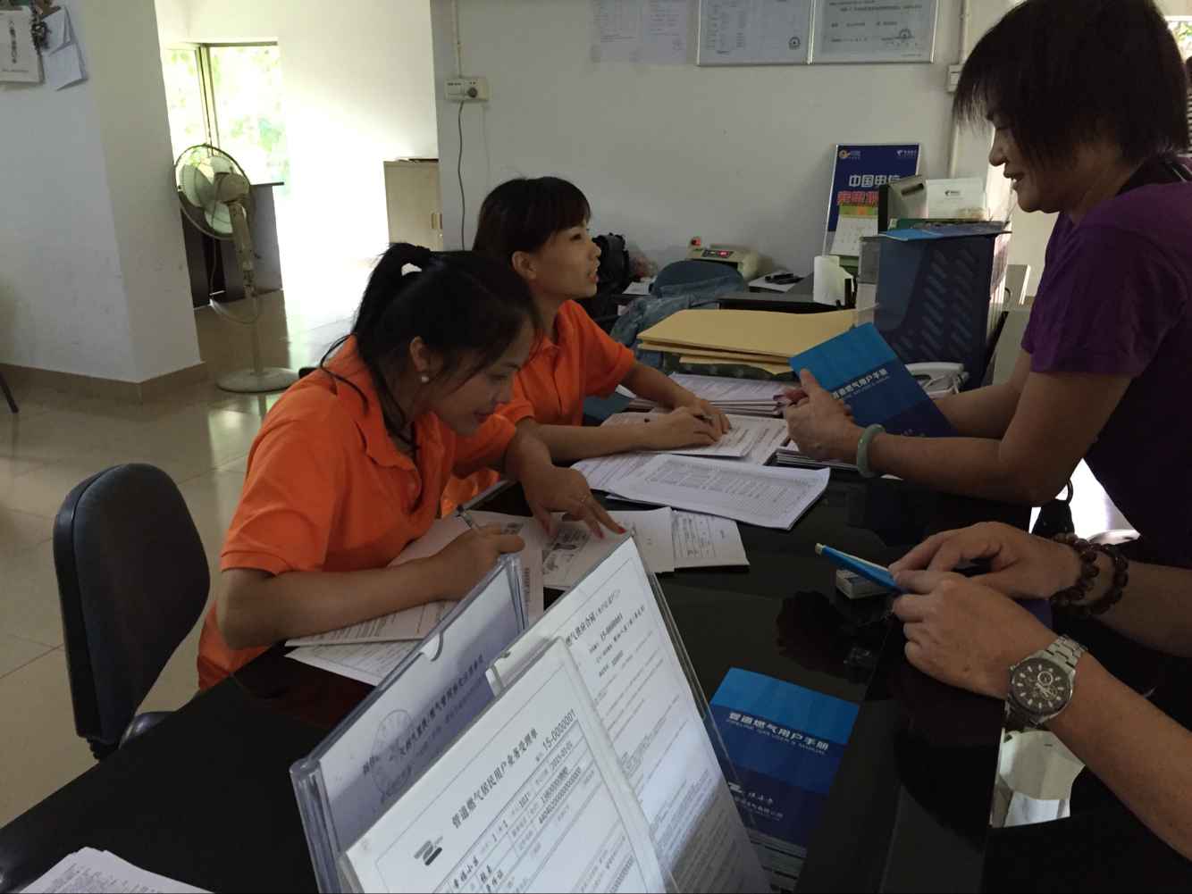 近期,管道燃?xì)夤境掷m(xù)開展燃?xì)夥⻊?wù)進(jìn)社區(qū)活動(dòng)。2015年7月31日、8月1日,管道燃?xì)饪头藛T駐點(diǎn)在頤和人家小區(qū)物業(yè)管理處,現(xiàn)場(chǎng)為該小區(qū)居民辦理開戶業(yè)務(wù)。