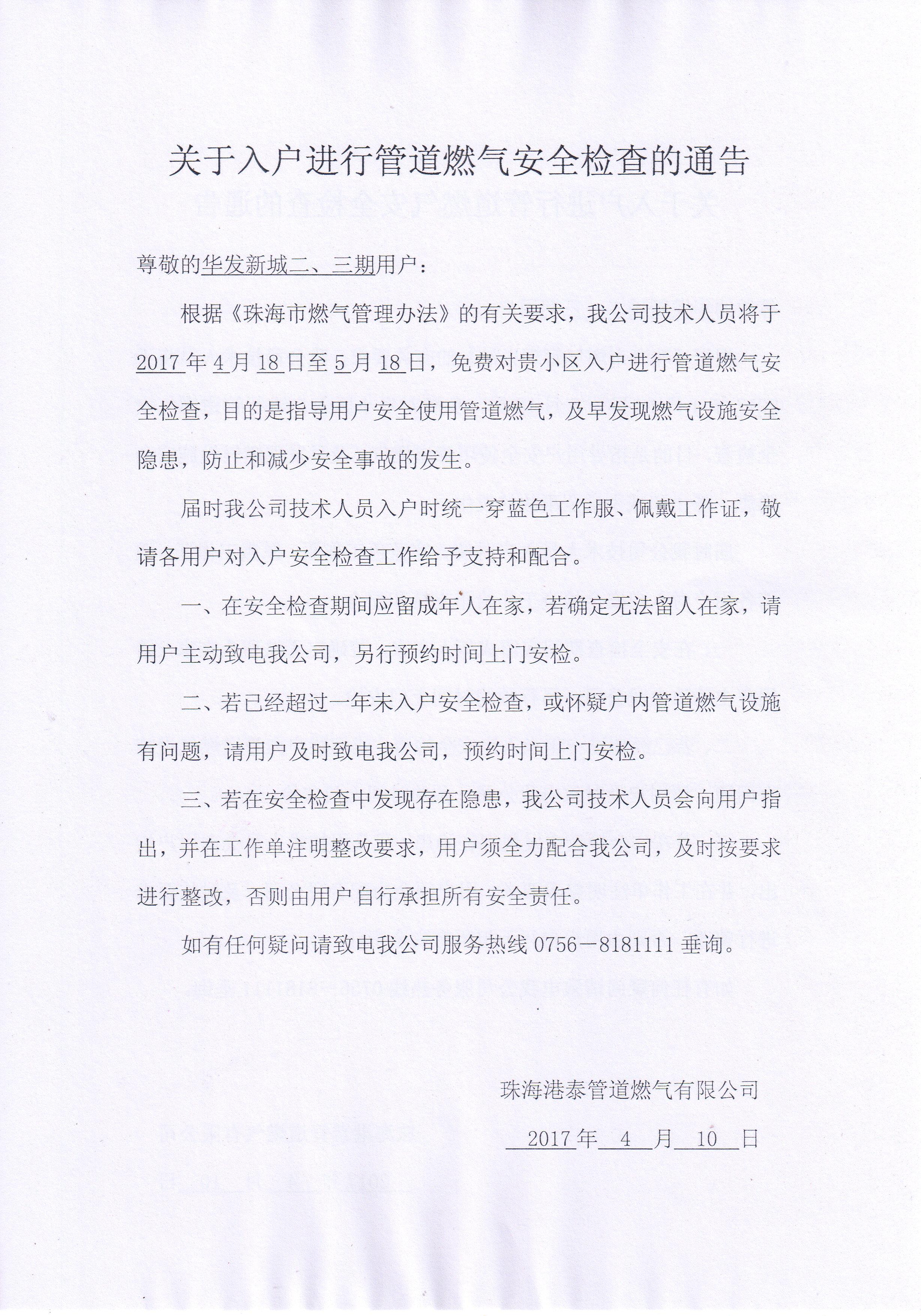 關(guān)于華發(fā)新城二、三期小區(qū)用戶入戶進(jìn)行管道燃?xì)獍踩珯z查的通告