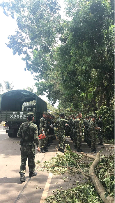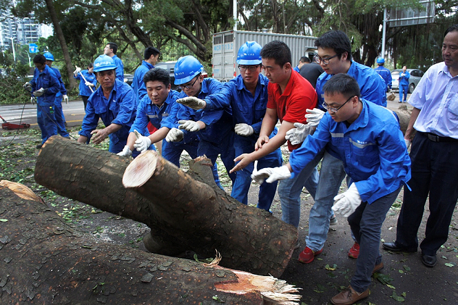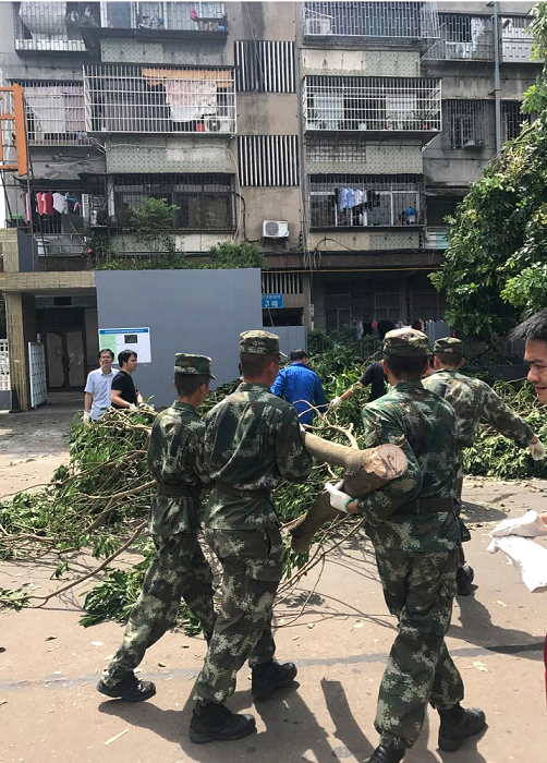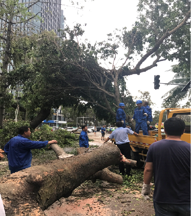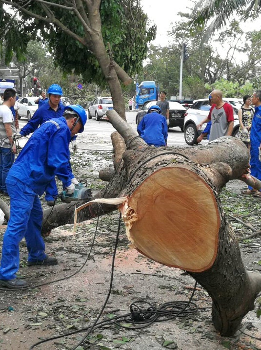 這遠(yuǎn)遠(yuǎn)還不夠,盡管環(huán)衛(wèi)工人日夜加班,廣州深圳的支援隊(duì)伍也日夜兼程,仍無(wú)法及時(shí)清理倒在路上的大樹,造成出行困難并且存在嚴(yán)重的安全隱患。于是,可以看到一抹抹藍(lán),扛著電鋸、帶著掃把和繩索,配合著全城的清障工作,一點(diǎn)點(diǎn)地清理著路面的障礙物。