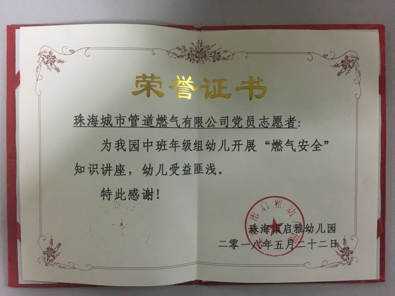 活動(dòng)結(jié)束后,珠海市啟雅幼兒園發(fā)展中心主任梁凱雯對(duì)黨員志愿者們表示感謝并給黨員志愿者頒發(fā)了榮譽(yù)證書(shū)。她表示,燃?xì)獍踩M(jìn)校園活動(dòng)使小朋友們受益匪淺,一定會(huì)留下深刻的印象,也讓家長(zhǎng)們多了一份安心,讓每個(gè)家庭多了一份安全。