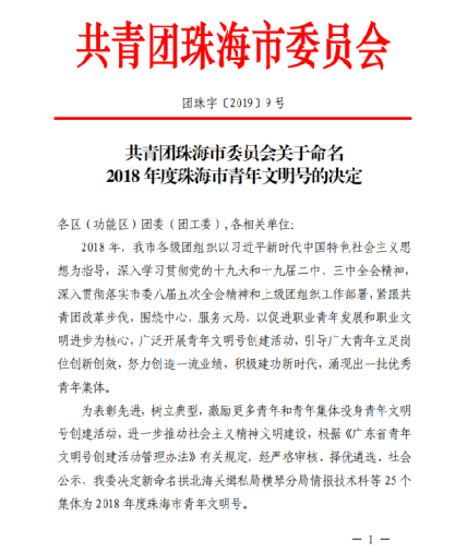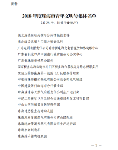 珠海港泰燃?xì)馇吧絻ε湔鞠搏@2018年度珠海市“青年文明號”榮譽稱號