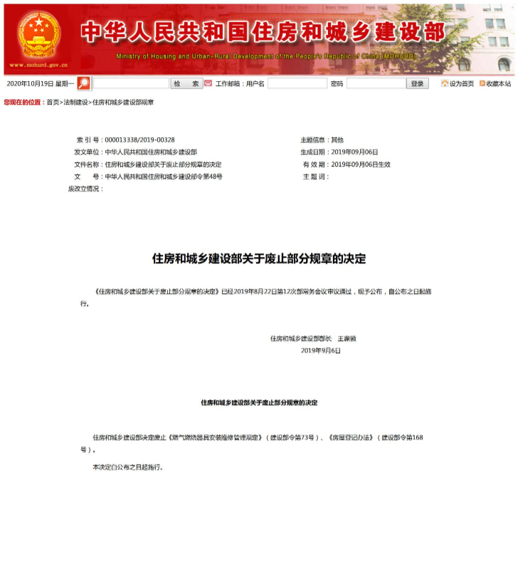 > 法律法規(guī)【轉(zhuǎn)】住房和城鄉(xiāng)建設(shè)部關(guān)于廢止部分規(guī)章的決定發(fā)布時(shí)間:2020/10/19
