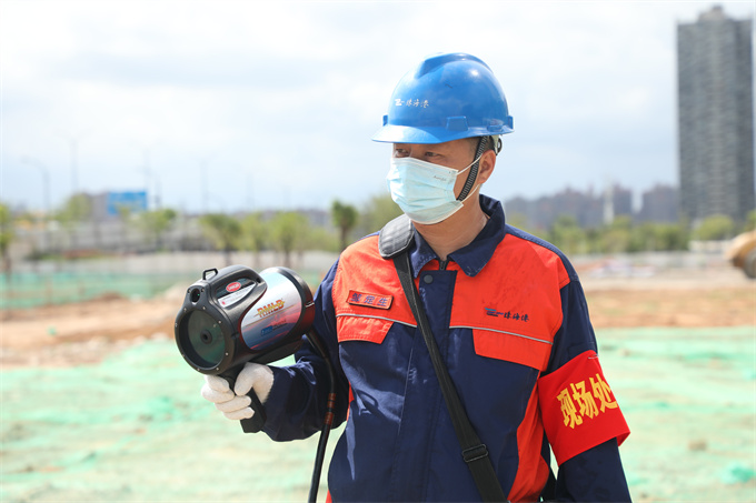圖說(shuō):現(xiàn)場(chǎng)處置組人員使用激光檢測(cè)儀檢測(cè)燃?xì)鉂舛取?/span>