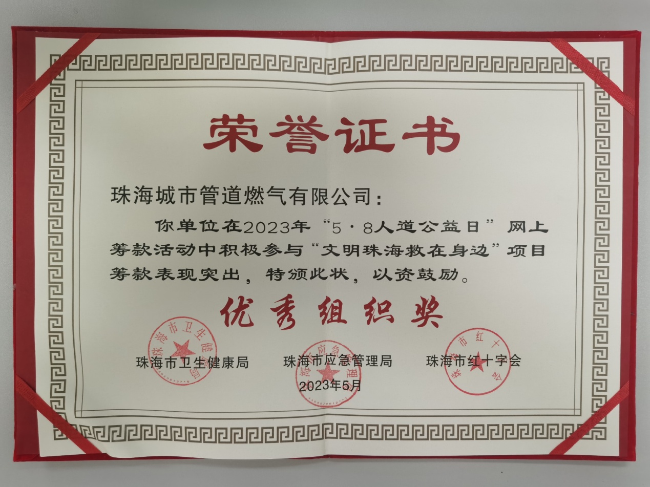 珠海城燃公司在珠海市“5﹒8人道公益日”網(wǎng)上籌款活動中獲優(yōu)秀組織獎