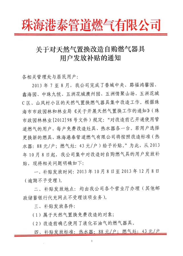 關(guān)于對(duì)天然氣置換改造自購(gòu)燃?xì)馄骶哂脩?hù)發(fā)放補(bǔ)貼的通知