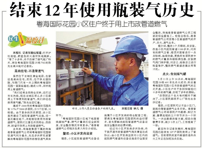 截至昨日記者發(fā)稿時,粵海國際花園已陸續(xù)有107戶居民使用上了管道氣。目前居民的室內(nèi)管道改造和點火工作正在加班加點實施。