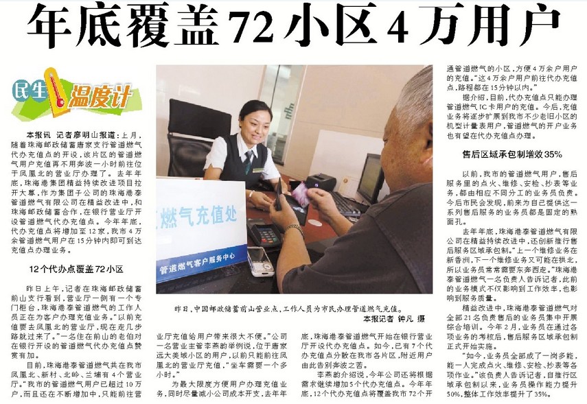 為最大限度方便用戶辦理充值業(yè)務,同時盡量減小公司成本開支,去年年底,珠海港泰管道燃氣開始在銀行營業(yè)廳開設代辦充值點。如今,已有7個代辦充值點分散在我市各片區(qū),附近用戶由此告別奔波之苦。