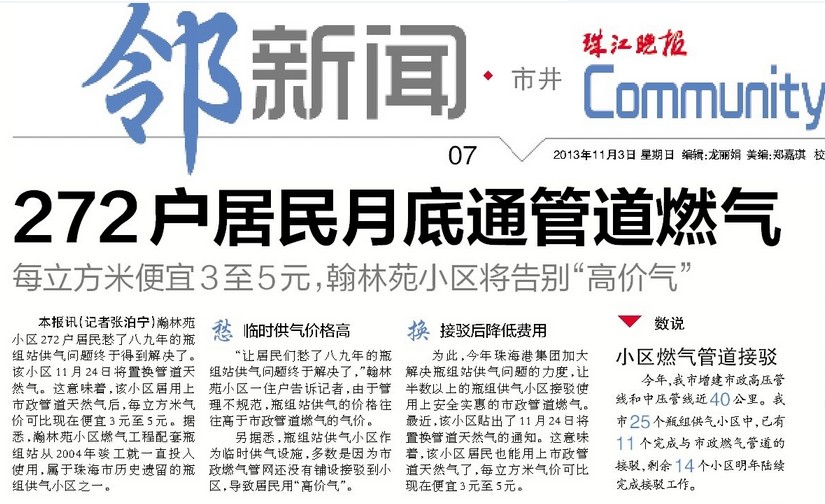 本報(bào)訊(記者張泊寧)瀚林苑小區(qū)272戶居民愁了八九年的瓶組站供氣問題終于得到解決了。該小區(qū)11月24日將置換管道天然氣。這意味著,該小區(qū)居用上市政管道天然氣后,每立方米氣價(jià)可比現(xiàn)在便宜3元至5元。據(jù)悉,瀚林苑小區(qū)燃?xì)夤こ膛涮灼拷M站從2004年竣工就一直投入使用,屬于珠海市歷史遺留的瓶組供氣小區(qū)之一。