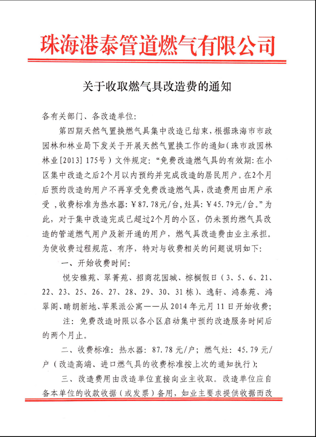 (悅安雅苑、翠菁苑、招商花園城、棕櫚假日(3、5、6、21、22、23、25、26、27、28、29、30、31棟)、逸軒、鴻泰苑、鴻翠閣、晴朗新地、蘋(píng)果派公寓)關(guān)于收取燃?xì)饩吒脑熨M(fèi)的通知