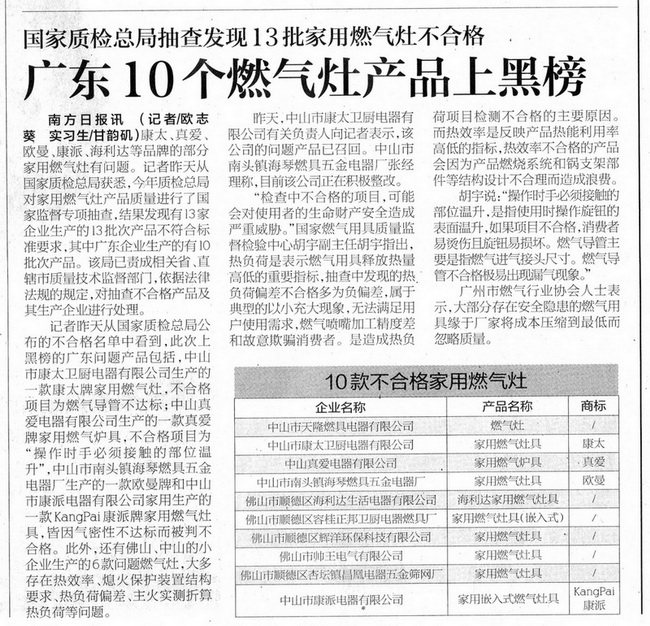 關(guān)于廣東10個(gè)燃?xì)庠町a(chǎn)品不合格