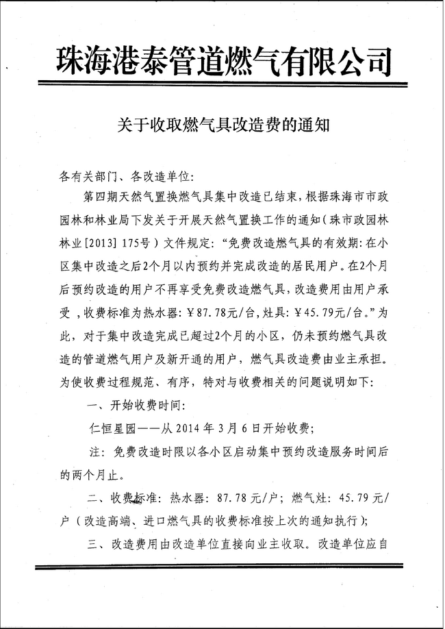 關(guān)于仁恒星園小區(qū)收取燃氣具改造費的通知