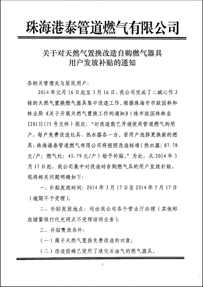 關(guān)于(二城心作2棟)小區(qū)天然氣置換用戶發(fā)放補(bǔ)貼的通知